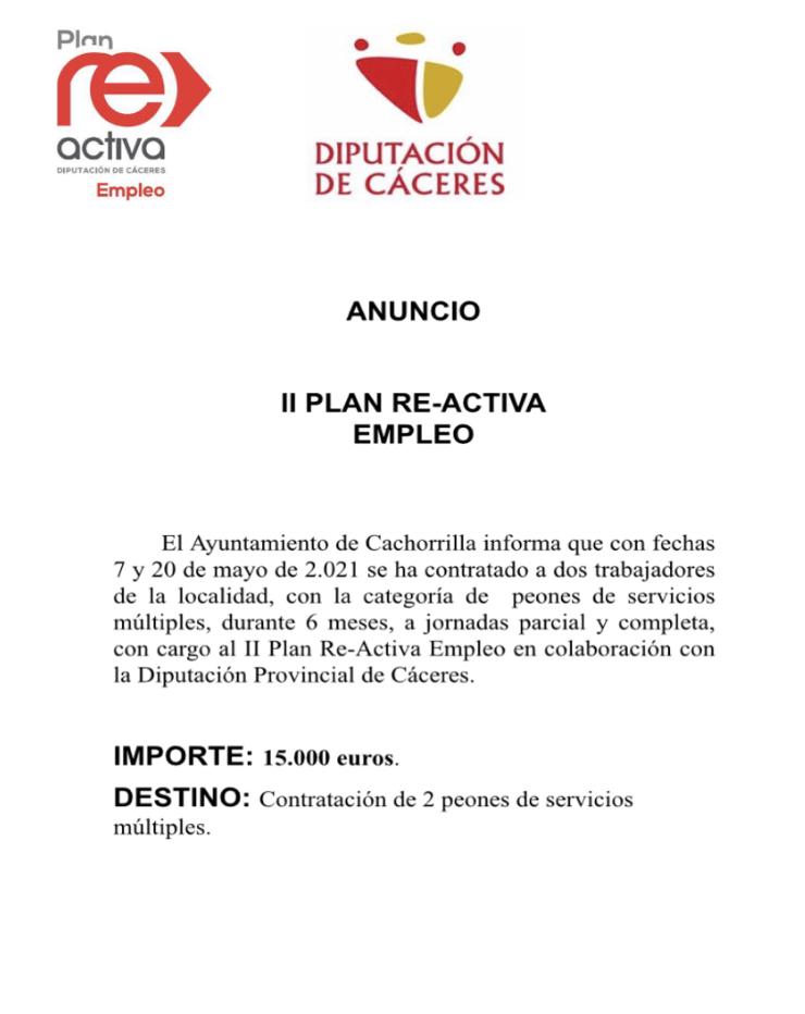 El Ayuntamiento de Cachorrilla informa que con fechas 7 y 20 de mayo de 2021, se ha contratado a dos trabajadores de la localidad, con la categoría de peones de servicios múltiples, durante 6 meses , a jornadas parcial y completa, con cargo al II Plan Re-Activa Empleo en colaboración con la Diputación Provincial de Cáceres.